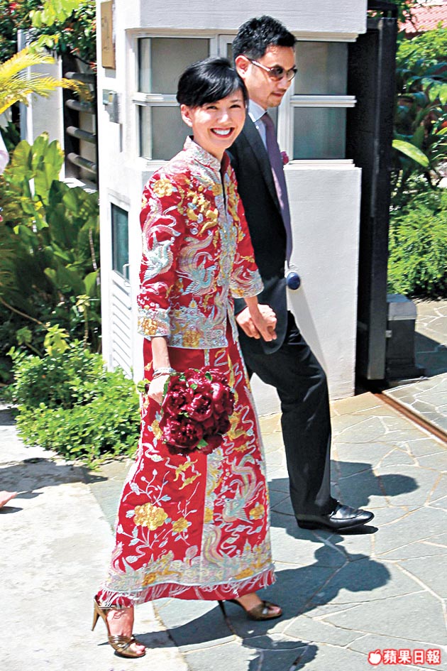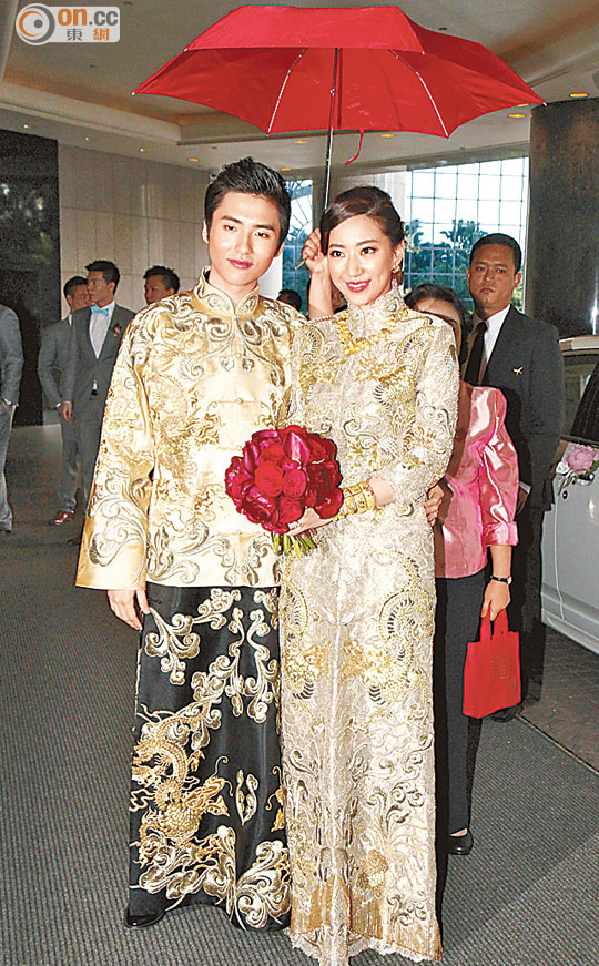 楊千嬅身著古粵名繡的褂皇,金銀線褂皇密度達99%,基本上看不到紅色的緞布,為褂中之皇。而新郎丁子高身著的也是搭配龍鳳褂男士穿的傳統馬褂,喜氣洋洋。