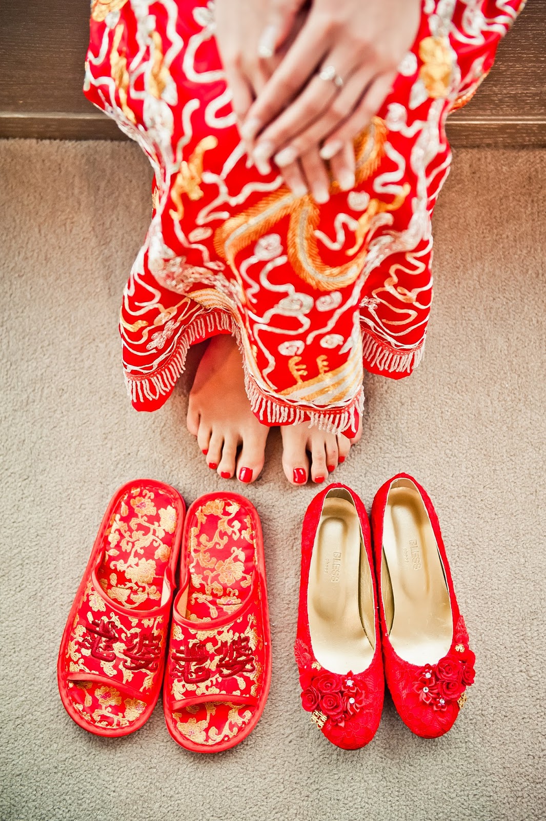 裙褂的長度剛到腳踝,所以紅鞋的搭配還是很重要的。跟裙褂一樣是刺繡而成的繡花鞋無疑最相襯之物。